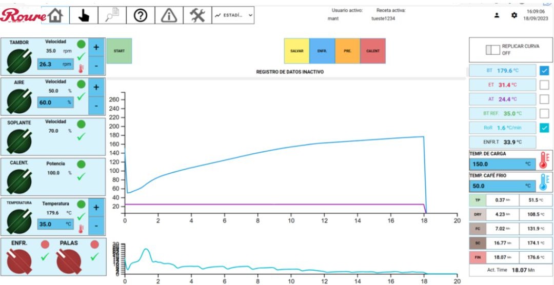 • Der Röster reproduziert die Referenzkurven exakt und passt automatisch die Leistung des modulierenden Brenners (prozentual gesteuert über unsere Software) an, um das perfekte Profil für jede Charge zu erreichen.